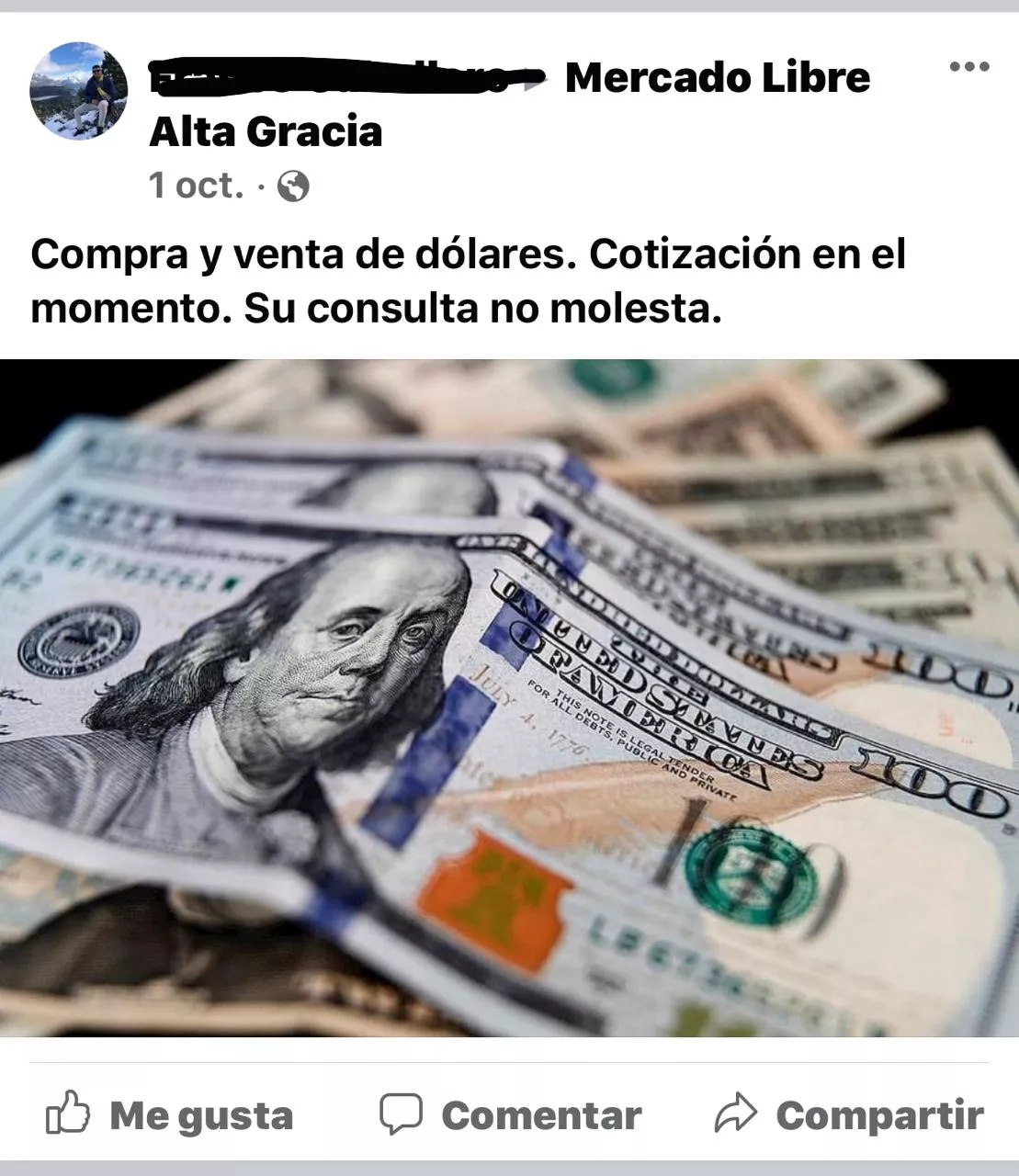 Es el caso del mercado negro de dólares, que se comercializa en las llamadas “cuevas” que ofrecen la divisa estadounidense de manera ilegal y también se ofrece por Facebook, Twitter e Instagram. Si bien hay grupos creados especialmente para la compra y venta del dólar paralelo, en Alta Gracia solo aparecen algunas publicaciones destinadas a ese fin.
