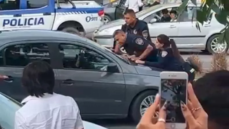 En el intento de fuga embistió a dos policías que, como consecuencia del impacto, terminaron arriba del capot del automóvil, causándole lesiones a uno de ellos en sus piernas, por lo que debió ser internado.