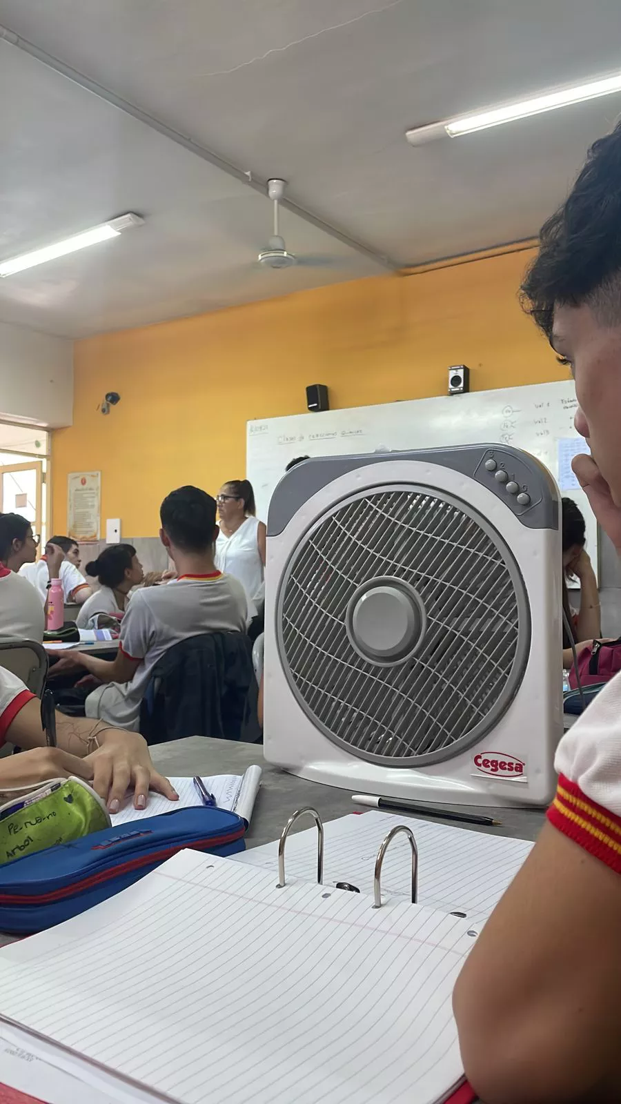 (SN, Alta Gracia) En medio de la ola de calor, los alumnos de la escuela Manuel de Falla de Alta Gracia llevaron ventiladores portátiles de sus casas para poder cursas en las aulas, que, según afirman los padres de los alumnos cuentan con poca ventilación.