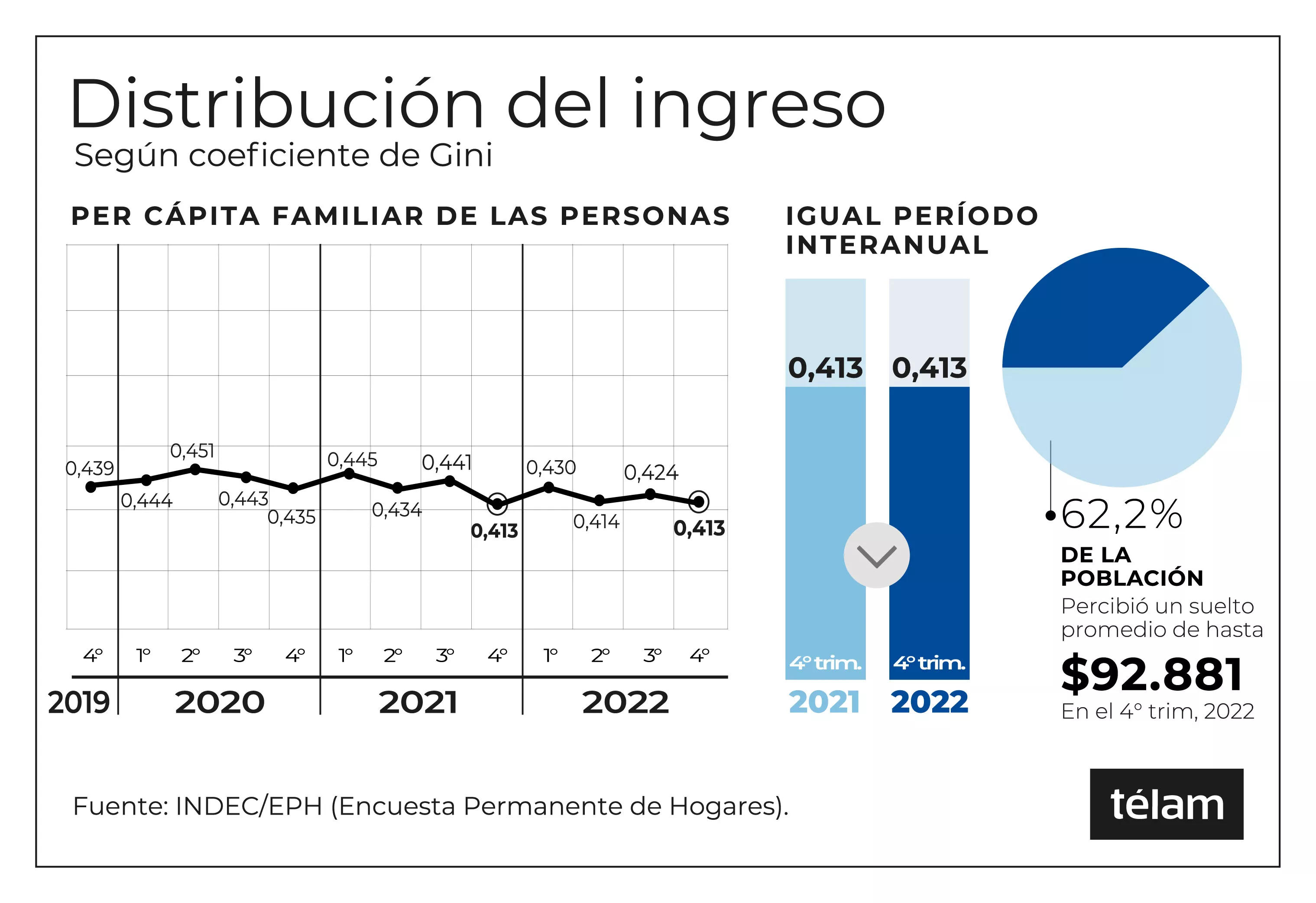 El organismo dio a conocer su informe trimestral sobre “Distribución del Ingreso”, el que incorpora el Coeficiente de Gini, una relación matemática que tiene al "0" como el nivel de mayor igualdad y al "1" con el mayor desequilibrio. Así, esta relación alcanzó en el cuarto trimestre del año pasado un valor de 0,413 puntos, similar al de igual período del 2021.