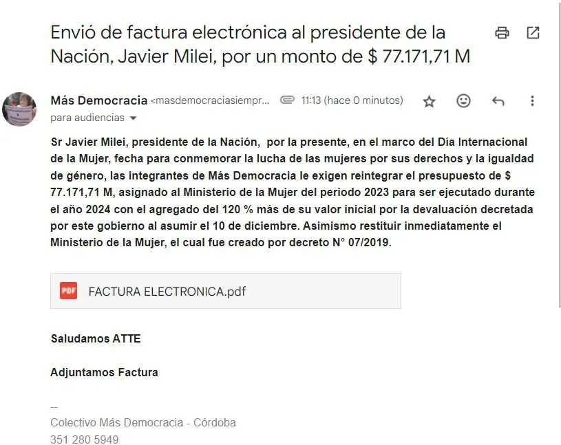 En el marco del 8M, el colectivo Mas Democracia le envió una factura electrónica al presidente de la Nación, Javier Milei, por un monto de $ 77.171,71 millones para que pague el reintegro del presupuesto del Ministerio de las Mujeres, Géneros y Diversidad.